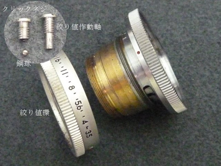 絞り値環側面には鋼球を収めたクリックネジと絞り値作動環ネジが位置しており、外します。クリックネジの中には鋼球のクッションを作り出すコイルバネが入っています。