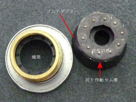 ゴムアダプター#3を絞り作動カム環に添えて、逆さにして絞り作動カム環上に絞り羽根を乗せたまま鏡筒より押し出します。