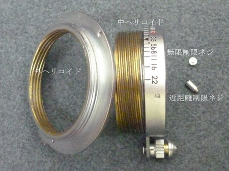 近距離制限ネジを外した後、中ヘリコイドを反時計方向に回転させると身二つとなります。
