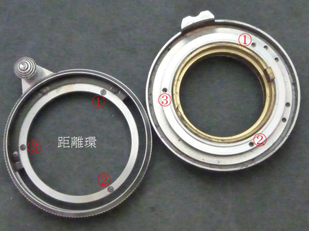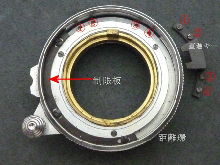 先に(1)と(2)のネジを外し、距離環を無限位置に戻します。それから(3)と(4)のネジを外し、直進キーを外します。