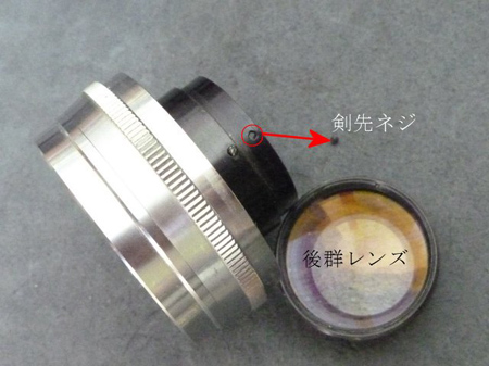 後群レンズの側面には先に外しました締め付け環のネジ切りがしてありますので、剣先ネジの閉め忘れに注意が必要です。