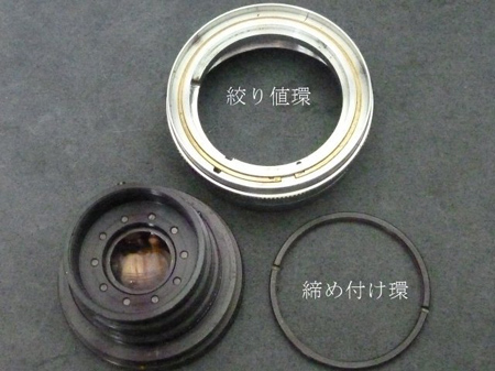 締め付け環を外し、絞り値を開放位置に設定すると絞り値環が外せます。