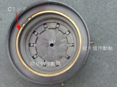 Cリングを外せば絞り作動環が外せますが、掴み所がありません。