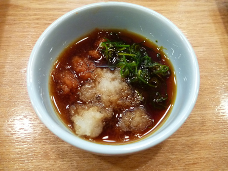 大将がカツオのタタキ一切れはポンズで味わいますか?ともみじおろしが入ったポン酢を用意してくれました。このぽんず美味しすぎます。