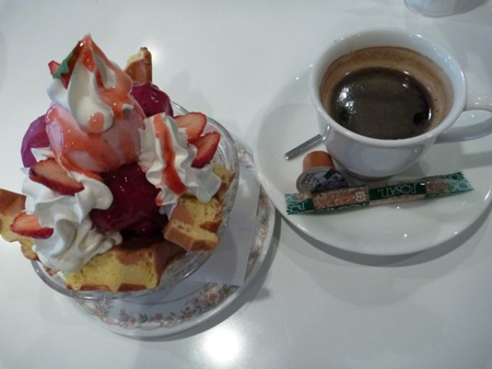 無粋な男二人、小皿を戴き分け合うのでした。(コーヒー550円、ワッフル1,050円)