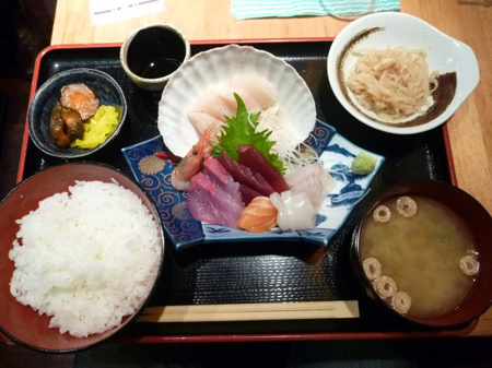 刺身定食(980円・コーヒー付き)はホタテ丸ごとでヒモまで付いており、甘く美味しい。八雲町の新鮮な魚貝を身近で楽しめるお店です。