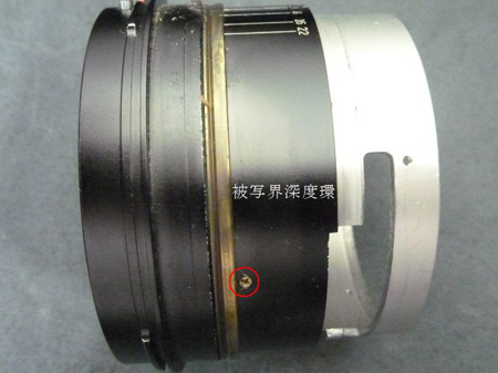 ヘリコイドを動かさないよう2本のネジを外し、被写界深度環を外します。