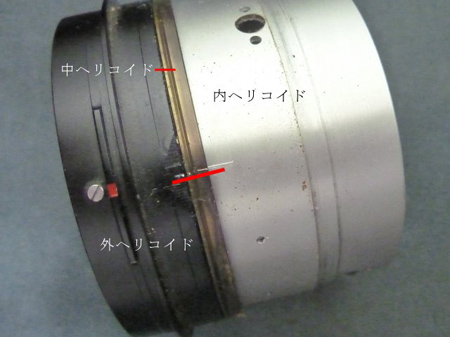無限位置にて外・中・内ヘリコイドに罫書きを入れます。