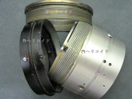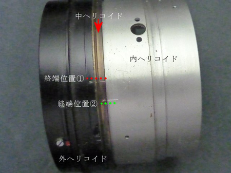 2) 今度は中と内ヘリコイドの位置を探ります。内ヘリコイドを反時計方向に回転させると終端位置(2)(緑点線)となります。