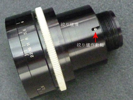 外せそうな部品は絞り値環のようです。絞り値作動軸を外しますと、絞り値環はネジ込み仕様でした。