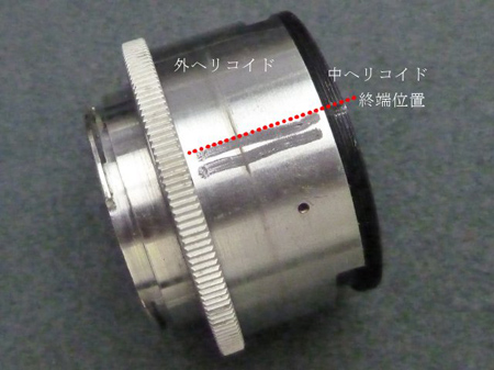 中ヘリコイドを時計方向に回転させますと終端位置となりまして、中ヘリコイドのネジ切りに合わせて外ヘリコイドに印を付けておきます。