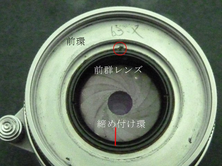 前環と前群レンズは、どちらかが緩まないようネジ切りをして剣先ネジで止めてある。 構造的には前環が外れるようだが、何しろ固い!!痛めている肘には酷ですね! ゴミが酷く締め付け環を外し、G1レンズをレンズサッカーで吸着するも引っ掛かりがあり分離できなかった。無理をするとレンズ生地周辺部の損傷に繋がります。