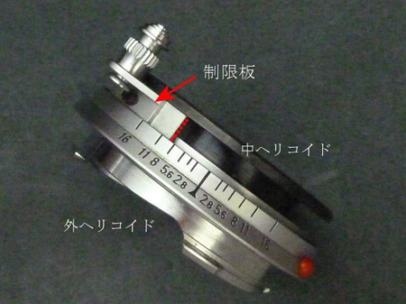 中ヘリコイドを時計方向に回転させると終端位置となり被写界深度目盛りの中央に合わせて印を付けておきます。