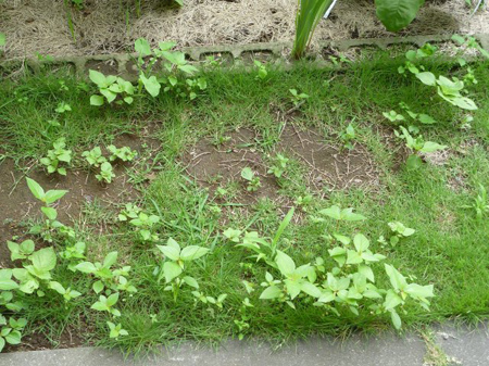 芝生に新たな雑草が生えています。除草しても時期が来ると新たな雑草が芽吹きましてイタチごっこです。