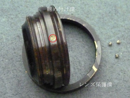 残りました前群レンズには社名環の緩み防止の剣先ネジ頭が見えます。この若干の突起を利用すれば外すことが出来るかも知れません。結果、無事に外すことが出来ました。