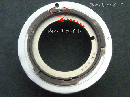 無限位置にて内ヘリコイドを赤点線矢印方向に回し終端位置(赤○部)の確認をしておきます。