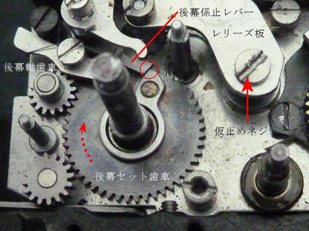 (先幕セット歯車を落とし込む際に後幕係止レバーが邪魔をします。ですから後幕が走り出さないように後幕軸を押さえておくことが重要です。)