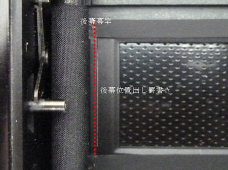 1)本体の後幕位置出し罫書き線に後幕幕竿先端を合わせます。