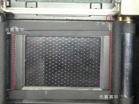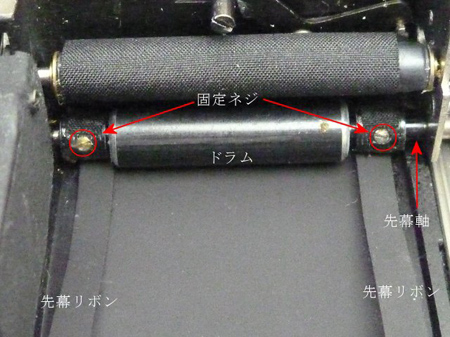 先幕は先に貼り付けてあると思いますが、貼り付けの平行がズレている場合は先幕ドラム固定ネジを目安として修正して下さい。