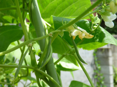 蔓無しから蔓ありインゲンに替えて花が咲き、小さなインゲンがぶら下がっていました。