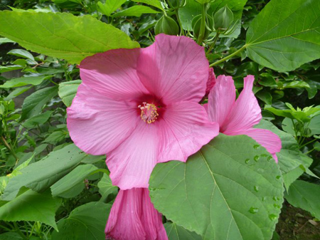明け方に降雨があったようです。大輪の芙蓉が派手さを誇っていますが、夕方には萎んでしまいます。