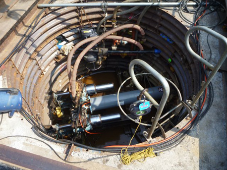 最新の工法はパイプの先に掘削歯があり、水を送り柔らかくして掘り進む推進工法と呼んでいるようです。作業者の説明によると直進だけでなくデーターを打ち込めば曲線も可能との事でした。