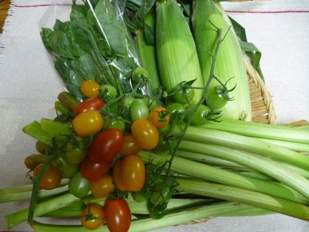 頂いて参りました野菜の数々。トウモロコシの品種ピーコックコーンはとても甘く美味しいです。ポタージュにしますと格別でした。
