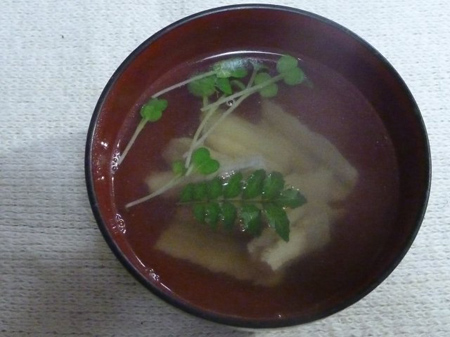 アラを加えて潮汁と致し、埼玉菜園より移植しました木の芽を浮かします。