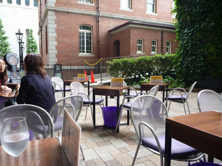 都会のビル群は無味乾燥です。三角形の定理で近道をすべく丸の内パークビルに入りますと中庭がありました。ほっとする空間ですね!数量限定160gのランチ(1,000円)が目に止まりました。若干感じる空気が重いですがテラスで味わうことにします。