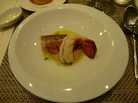 贅沢な食材オマール海老と白花豆のフォンデユータ・ベルガモットのオイル。