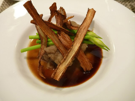 牛タン煮込みの・ゴボウソース添え。ゴボウティプは香りが良く美味しく、これだけでも肴になりえます。アスパラ似はカタクリの花、ほろ苦さが北国の初夏を思わせます。