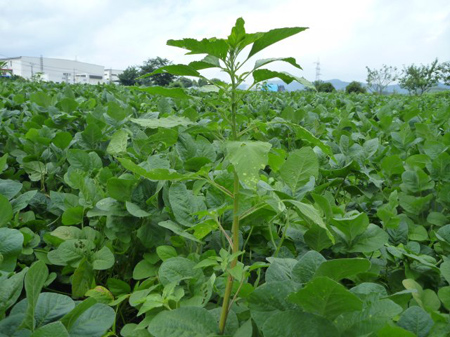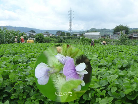 大豆が成長した畝間に入るのは、枝が重なり合い足下に注意が必要です。