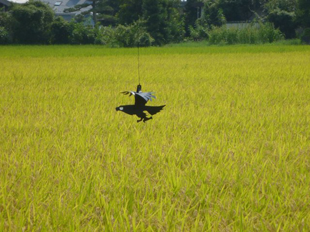 昨今は効果が無いのか?案山子を見かける事は稀です。疑似カラスが一羽目を光らせておりました。