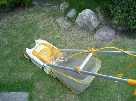 日陰が伸びてきましたので芝刈り機を動かします。芝を伸ばしすぎて押すに力が要ります。