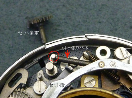 セット歯車を外し、セット環を逃がしながら引っ張りバネを傷めないよう掛かり(赤○部)を外します。