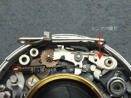 遅延機構部押さえ板は2本のネジで固定してあるが、(1)のネジにはバネがとりつけられており、バネの一端は赤○(1)でありシャター後室の側壁に位置する。もう一端はセット環係止レバーが折曲がった凹みに掛かるのです。