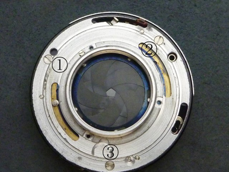 3本のネジを外し、絞り値設定環を外し、現れたシンクロM-X環も外します。