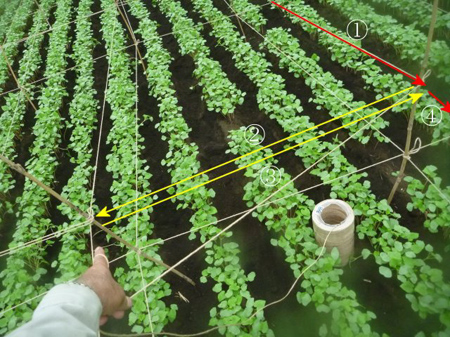 最初に畝方向(赤矢印)に紐を掛け、畝を横切るように(黄色矢印)掛けて戻ります。