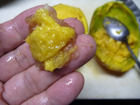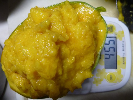 マンゴーは455gで皮と種が110gでしたので実質果実は345gになりました。