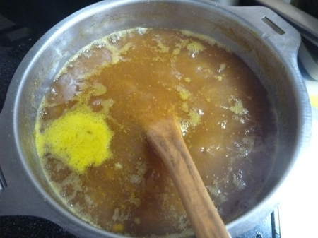 黄色いアクはマンゴーから湧き出たと思います。雑味になり得ますので丁寧に掬います。
