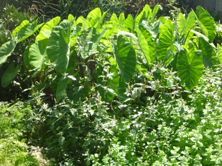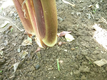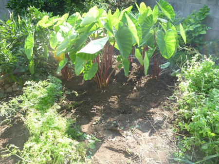 雑草を取り除いた八頭芋の根本に子芋が顔を出しています。