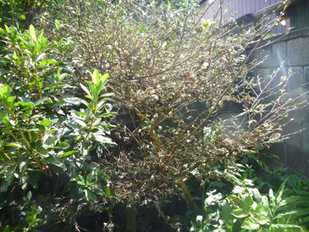 その先にありますサザンカの緑が消え落葉樹状態です。近寄るとチャドクガの幼虫により丸坊主でした。年2回発生しまして2回目に大量発生したのですね!