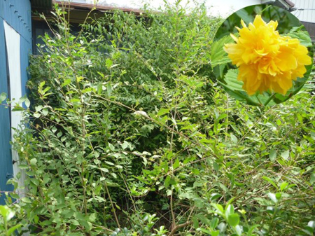 時期はずれに山吹一輪。茂らせてしまいましたね!其れに小鳥が運んだのか?雑木も茂って藪蚊の住みかになってしまいました。