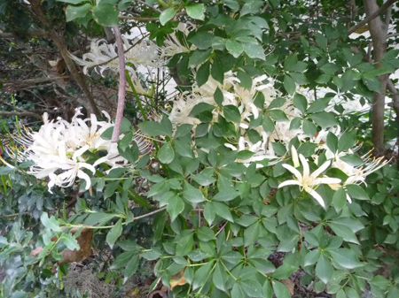 ドウダンツツジの葉陰に白の曼珠沙華。