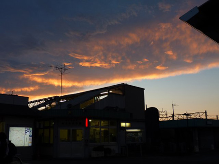 前線の境目でしょうか?焼けた雲が暮れなずむ空にルージュを引いていました。