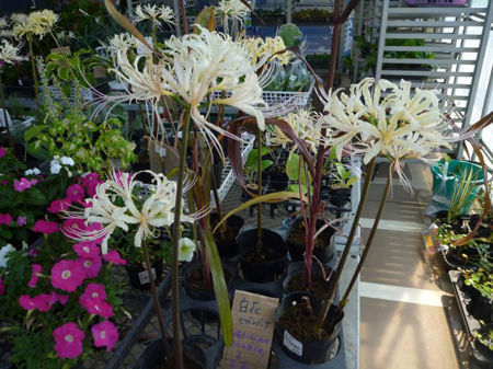 堤下のJA農産物販売所で赤に比べると白曼珠沙華ポットは倍の800円で販売していました。赤に比べると増えないのでしょうね!