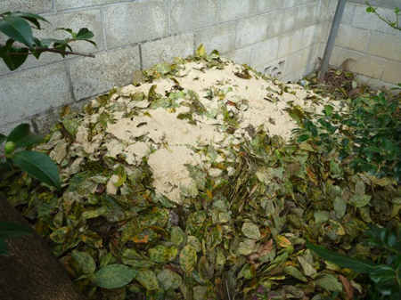 掃き集めた落ち葉は米糠と合わせて庭隅に積み腐葉土を作ります。