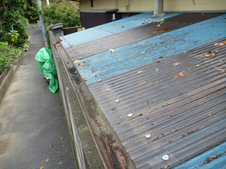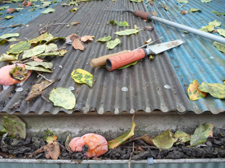 落ち葉で物置の樋が埋まっています。大雨が予想されますので掃除を致します。