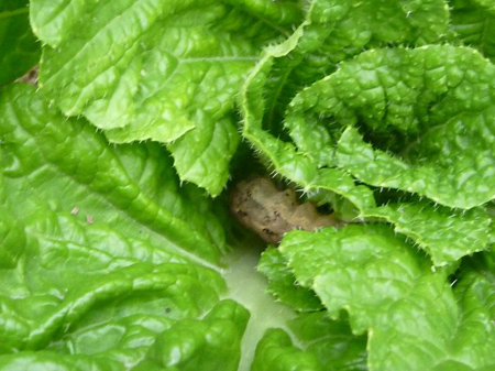 良く観察しますと、とある株の葉の中に茶色の生き物が。。。穿り出しますと食料豊富で大きく育ちましたヨトウムシでした。捕殺致します。