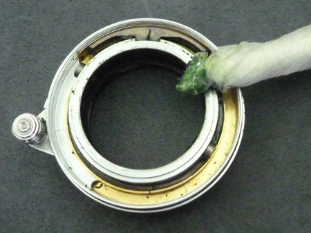 前群レンズは固く締め付けてありました。外したままにしますと絞り羽根が落ちてしまいます。軽く締め付けておきます。